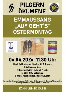 Emmausgang am Ostermontag Ökumenisch Pilgern Eröffnung das Pilgersaison 2026 am 6. April 2026 mit Pilgerbegleiter Roland Nusko Weitere Termine in 2026: