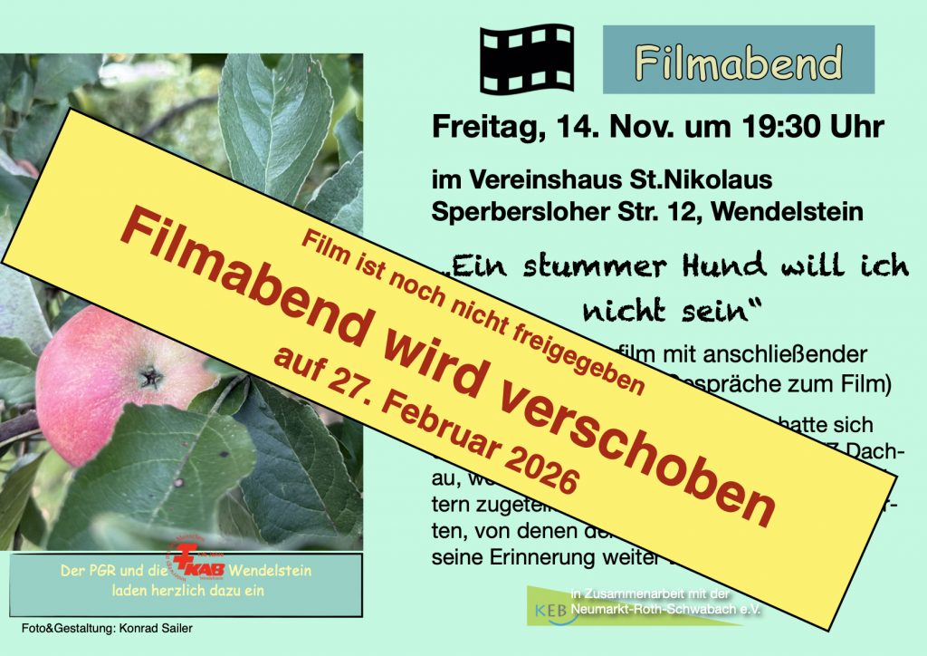 Filmabend am 14. Nov. wird verschoben auf 27. Febr. 2026