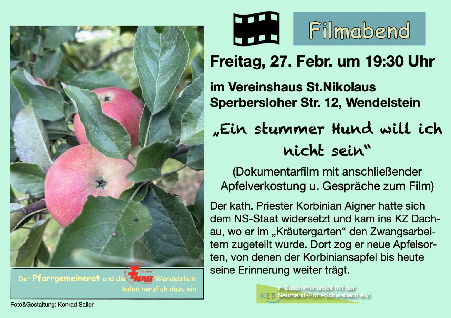 Filmabend: „Ein stummer Hund will ich nicht sein“ (Dokumentarfilm mit anschließender Apfelverkostung u. Gespräche zum Film) Der kath. Priester Korbinian Aigner hatte sich dem NS-Staat widersetzt und kam ins KZ … Filmabend – „Ein stummer Hund will ich nicht sein“ am 27. Febr. weiterlesen